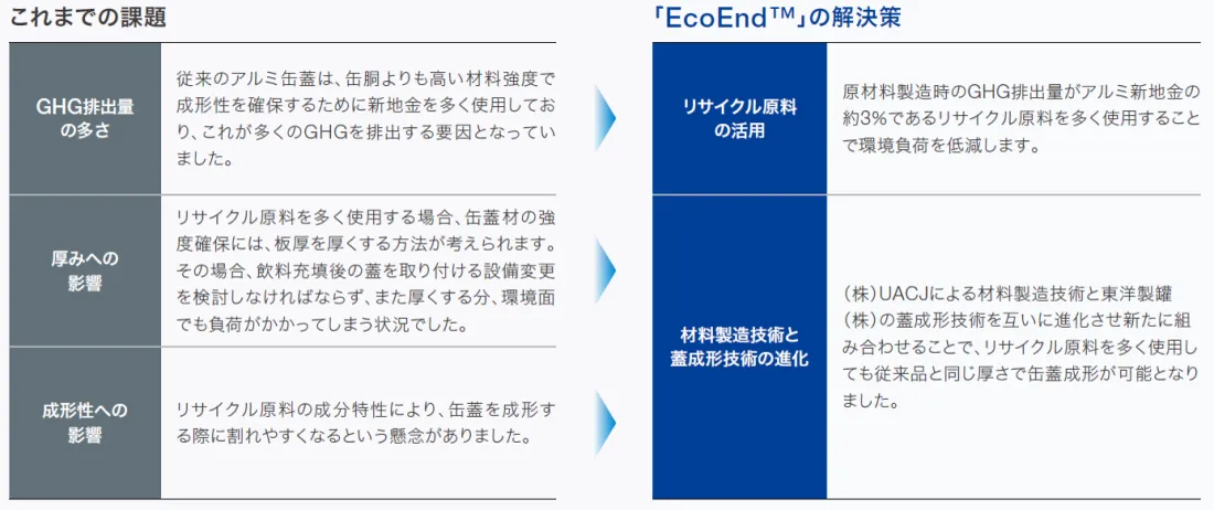東洋製罐株式会社(以下「東洋製罐」)と株式会社UACJ(以下「UACJ」)との協業により開発された「EcoEnd™」は、使用済み飲料缶(UBC:Used Beverage Can)などのリサイクル原料の割合を増やすことで環境負荷を大幅に軽減した次世代のアルミ飲料缶蓋です。従来の製品と同等の品質を維持しながら、温室効果ガス(GHG)排出量を劇的に削減することで、持続可能な社会の実現に大きく貢献します。東洋製罐とUACJとの協業により開発された「EcoEnd™」は、使用済み飲料缶(UBC:Used Beverage Can)などのリサイクル原料の割合を増やすことで環境負荷を大幅に軽減した次世代のアルミ飲料缶蓋です。従来の製品と同等の品質を維持しながら、温室効果ガス(GHG)排出量を劇的に削減することで、持続可能な社会の実現に大きく貢献します。