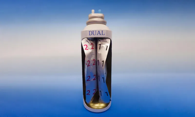 ワンプッシュで2つの内容物を同時に吐出可能な世界初のシステム。環境に優しい窒素を使用