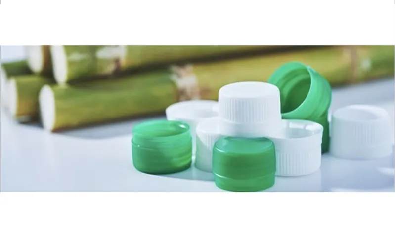 バイオマス材(植物由来プラスチック)を配合した飲料用キャップ。現在調味料用キャップ、パウチ用スパウトキャップを開発中
