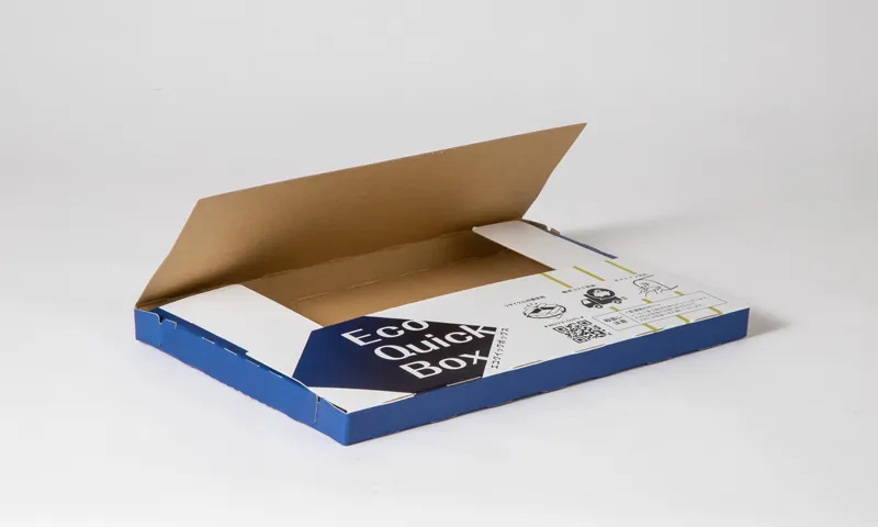 EC向け薄型段ボールケース。従来の形態に比べて10%以上の資材削減と、独自開発した製函機で、組み立て作業工数の大幅削減を実現