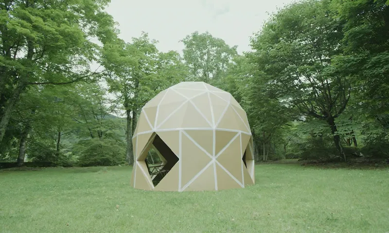 段ボール製の組立式テント。利用後はリサイクル可能。特殊なラミネート技術で屋外での利用も可能