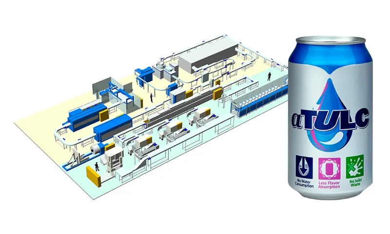 環境配慮型製品であるaTULCの製缶技術を導入した、「省スペース、短工期、低コスト」を実現する製缶システム。従来の大型ラインの半分程度のスピードで年間2~3億缶を生産可能。