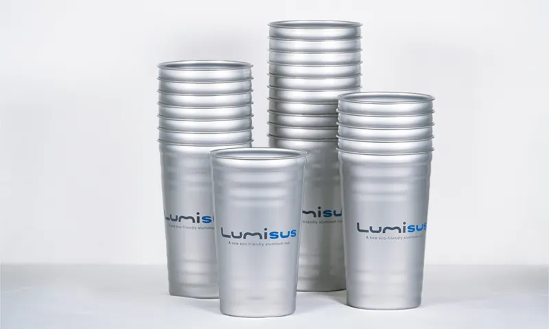 環境負荷低減を目的に、水平リサイクルが可能なアルミニウムを使用したカップ。製造時の水使用量ゼロなど環境へ配慮した容器を実現