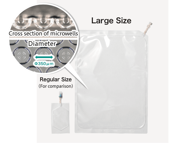 This is a scale-up product from the WELLBAG-S series products. It has 20 times culture area of WELLBAG-S series. The number of wells is about 36 times that of S500 and about 20 times that of S350. The bag is A3 size and it can be placed in a standard type incubator with a dedicated holder.