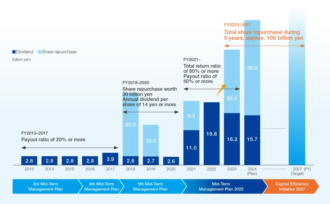 through dividends and share repurchases. In FY2023, we repurchased 20 billion yen of our own shares, as planned, and paid out an interim dividend of 90 yen per share (for a total of 16.2 billion yen in dividends). However, because net assets increased due to larger-than-forecast yen depreciation and higher stock prices, we increased our share repurchases by 10 billion yen for FY2024, from the initial plan of 20 billion yen to 30 billion yen. This flexible response to changes speaks to our intent to make steady progress on achieving our plan. It does not change our initial plans to repurchase a cumulative total of 100 billion yen in shares by FY2027.