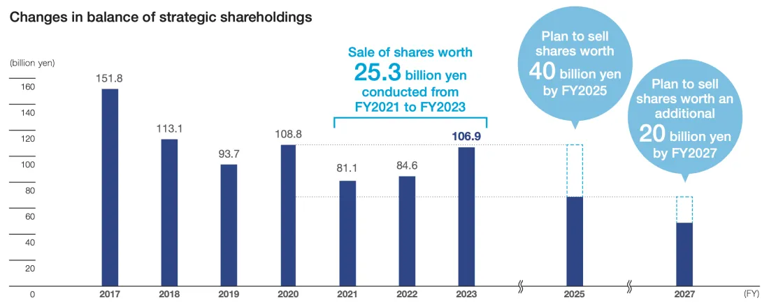 Regarding the reduction of strategic shareholdings, we have set 40 billion yen for this purpose in Mid-Term Management Plan 2025 together with an additional 20 billion yen in Capital Efficiency Initiative 2027, for a planned total execution of 60 billion yen in sales. Given the steady progress on our plan, the remaining amount for sales is roughly 35 billion yen. In consideration of rising stock prices, we are envisioning a rise to roughly 40 billion yen on these sales, and are keeping an eye on trends in the stock market.