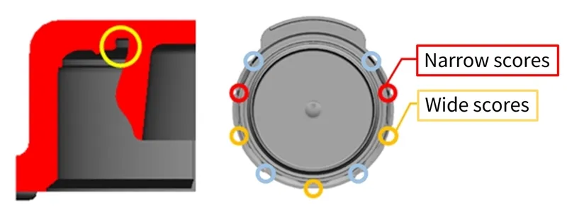 To reduce the capping force, we thinned the base of the inner ring of the cap. We have placed narrow and wide scores*, taking into account both the ease of opening and capping.