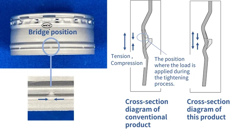 By narrowing the width of the bridge, it is now possible to break the bridges with less torque than conventional caps. However, to resolve the issue of bridge breakage caused by sealing the cap with the narrowed bridge after filling, the bridge section was curved to improve resistance to bridge breakage.