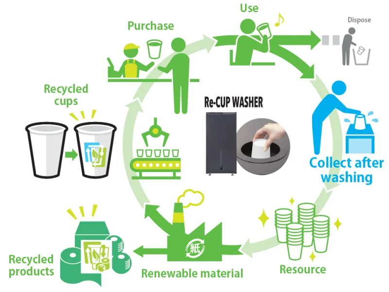 * Used paper cups can be brought to recycling paper production plants after food and beverage residues are removed, allowing the extraction of recycled paper material. At Toyo Seikan Group, we are promoting the 'CUP to CUP' initiative, which involves manufacturing new paper cups using recycled paper material derived from used cups. Aiming to realize a circular economy where limited resources are reused from one product to another, we are also engaged in awareness activities for cup cleaning and recycling using the Re-CUP WASHER.