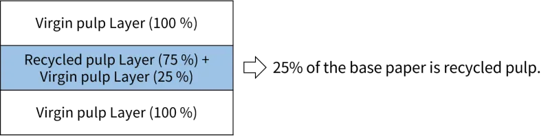 Tiny fragments of ink and laminated film that may remain during the re-pulping process can appear as specks on the surface of paper cups. To prevent this, the base paper of this product is designed with a three-layer structure, using recycled pulp only in the middle layer. As a result, such fragments are not visible on the surface, which improves the overall appearance.