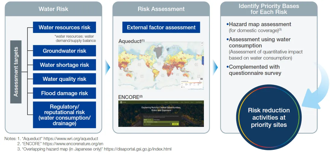 Covering the 93 main Group production bases, both in Japan and overseas, we place risks into six categories (water resources, groundwater, water shortages, water quality, flood damage, regulatory and reputational) and then conduct a risk assessment. When conducting the assessment, we first assessed risks from base sites using Aqueduct(1) and then assessed the dependence and impact on business activities using ENCORE(2). We consolidated these various risk assessments and then classified the external factor assessment into three levels (Priority 1 to Priority 3). Targeting bases with high Priority 1 risk as found in an external factor assessment that combined water consumption at bases, hazard maps, and questionnaire survey results, we identified the high-risk priority bases.