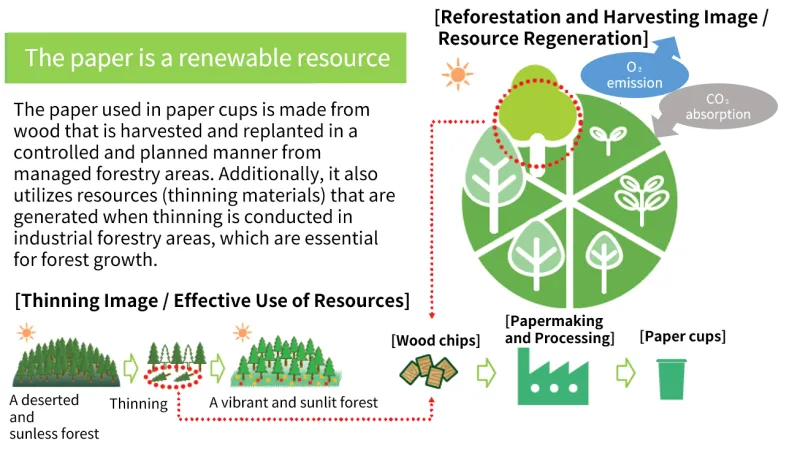 Tokan Kogyo manufactures and sells paper cups using thinned wood as raw material. Thinning refers to the selective cutting of some trees to promote the growth of the remaining trees and maintain the health of the forest. The timber obtained from thinning is referred to as thinned wood. By using thinned wood, Tokan Kogyo contributes to forest conservation and achieves sustainable resource utilization.