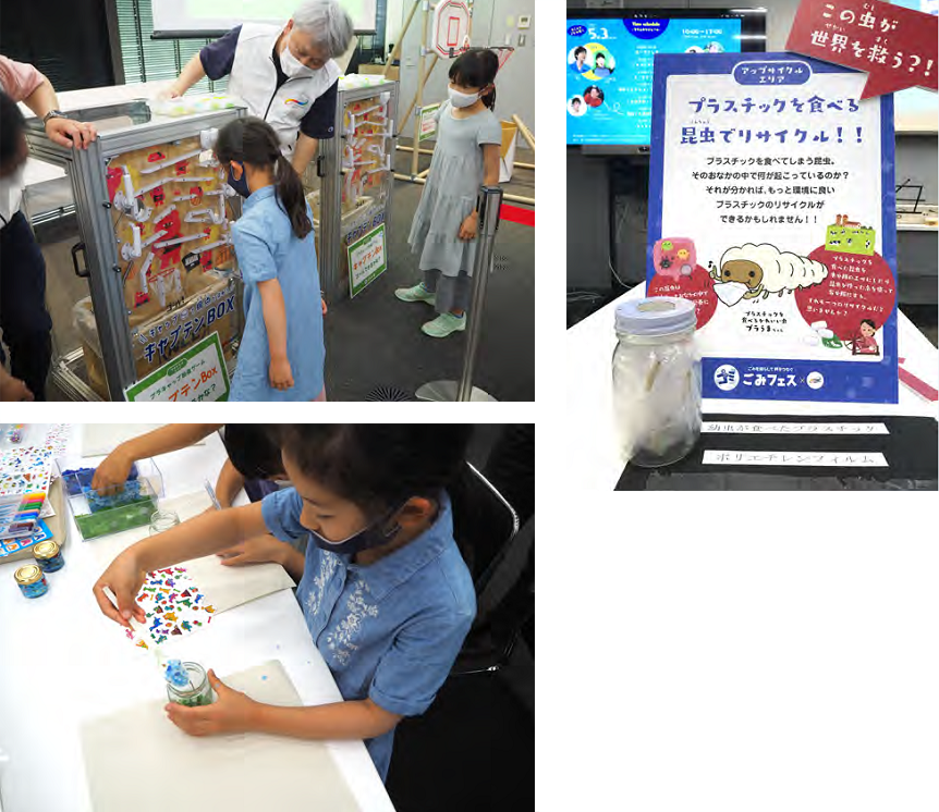 Admission was granted in exchange for recyclable waste containers brought by the visitors. At the venue, we arranged interactive exhibits with products developed by the Group, including a prefabricated cardboard tent that is recyclable; Captain Box, game-like equipment to collect used PET bottle caps; Re-CUP WASHER, a cup washer to promote paper cup recycling; and Loopiece, craft materials “upcycled” from used glass bottles. The stage featured a talk session with Mr. Takizawa, other comedians and guest speaker Ken Noguchi, an alpinist and environmental activist, as along with a picture-story show and music performance themed around waste issues and the SDGs.