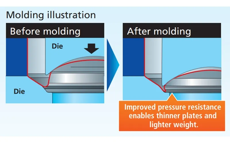 Toyo Seikan has successfully developed aluminum beverage cans using compression bottom reform (CBR) technology, which involves reinforcing and lightweighting the bottom of the cans. This technology has been applied to aTULC cans with a diameter of 202 (190ml) and Aluminum DI cans with a diameter of 211 (350ml and 500ml). This development has made it possible to reduce the weight compared to conventional aluminum beverage cans.