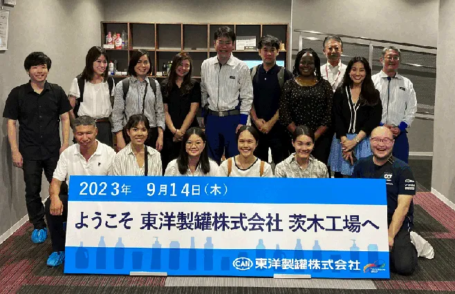At Toyo Seikan, we welcomed 13 factory tour participants from Toyo Food Industries Junior College's short-term study abroad program. We greeted them with flags representing their respective countries and made efforts to provide explanations about the factory using English materials, ensuring an enjoyable and informative tour for the students.