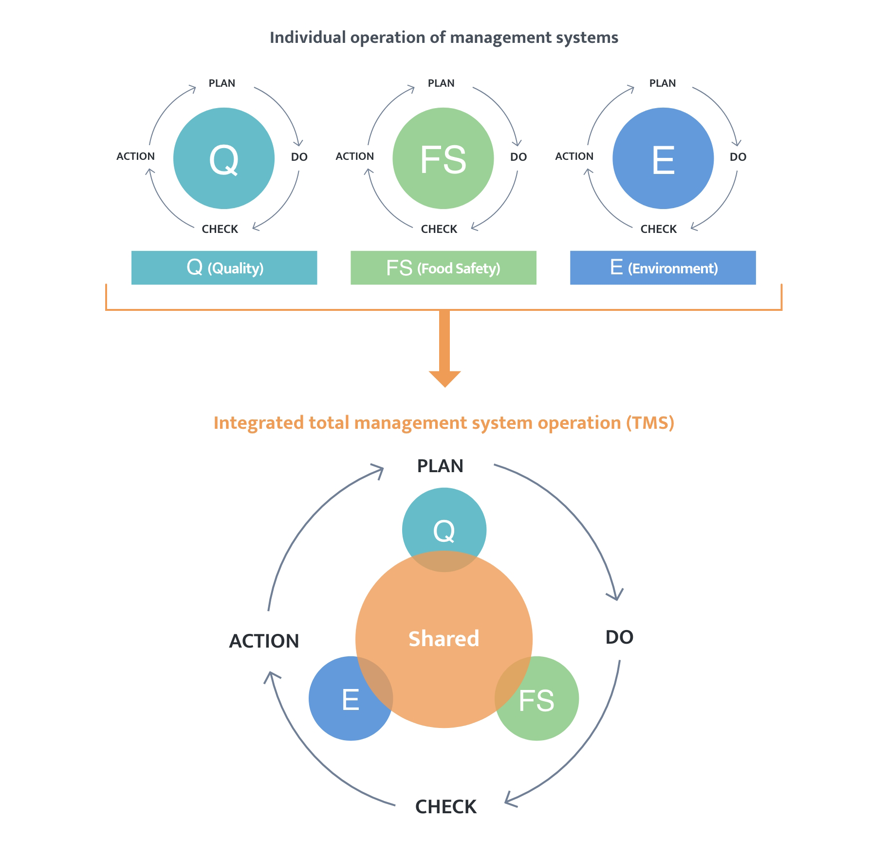 Toyo Seikan, Toyo Glass and Mebius Packaging, in particular, operate a Total Management System (TMS), which integrates three management systems for quality (ISO 9001), food safety (FSSC 22000) and environment (ISO 14001). The system integration allows the companies to reduce overlaps in operations and expand their focus from sub-optimization to total optimization. Using the dynamic system that links their management systems closely with actual business activities, they are committed to promoting manufacturing that earns the trust of customers.