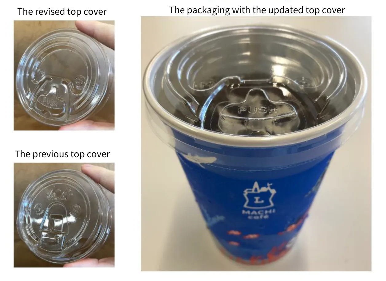 We have improved the strawless lid to enhance the aroma experience, allowing consumers to fully enjoy Lawson MACHI café iced drinks while targeting our goal of reducing plastic usage and prioritizing universal design. By selecting a “Lip Push Lid” design, which allows the cup’s mouth to open downward with a gentle press of the upper lip, and by enlarging the aroma window that opens both upward and downward, we enable consumers to better enjoy the aroma while drinking. The mouth of the lid is cut in a wavy shape for improved visibility and safety. Following prototype demonstrations, these enhancements were well received, leading to the lid’s introduction in August 2023 and a nationwide rollout by March 2024.