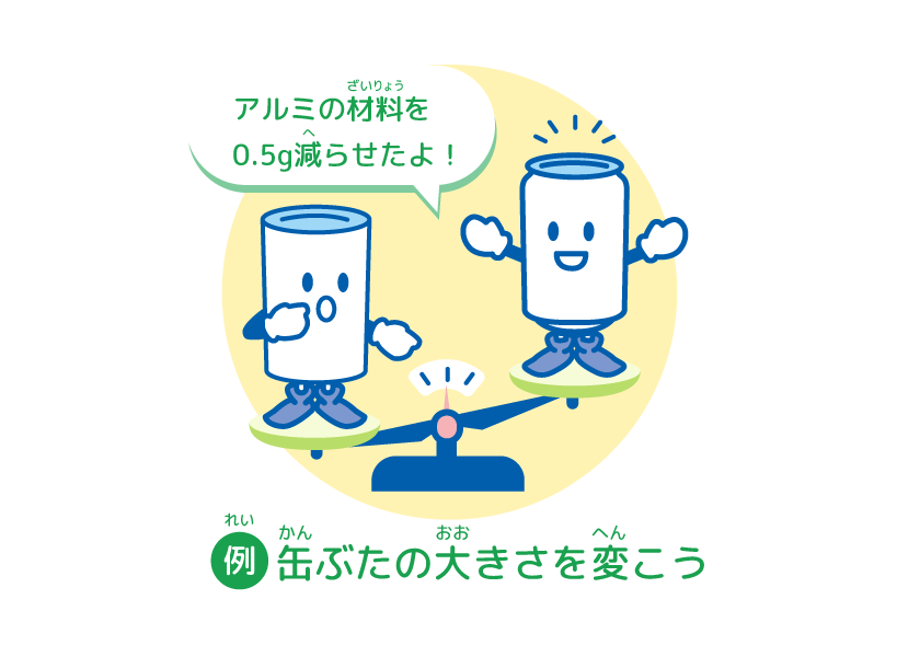 「リデュース」は、原料(げんりょう)を減(へ)らしてしげんを大切(たいせつ)にすることだよ。容器(ようき)が軽(かる)くなると、材料(ざいりょう)が少(すく)なくすむから、使(つか)うしげんの量(りょう)も減(へ)らせるし、その容器(ようき)を運(はこ)ぶときのエネルギーも減(へ)らせるんだって。