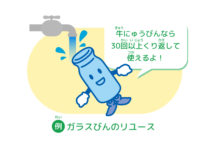 「リユース」は、一度(いちど)使(つか)った物(もの)をくり返(かえ)し使(つか)うことだよ。たとえば、牛(ぎゅう)にゅうびんをきれいにあらって、また牛(ぎゅう)にゅうを入(い)れるために使(つか)うのは「リユース」だよ。何度(なんど)も容器(ようき)として使(つか)うことで、ごみにならないんだ。