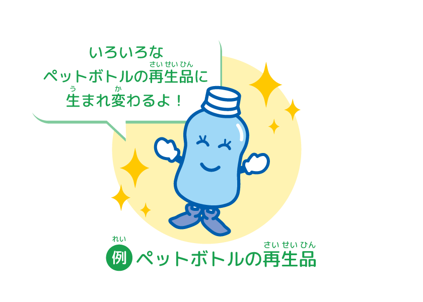 「リサイクル」は、使(つか)い終(お)わった物(もの)をもう一度(いちど)、原料(げんりょう)にもどしてから、新(あたら)しい物(もの)を作(つく)ることだよ。たとえば、ペットボトルを集(あつ)めて、また新(あたら)しいペットボトルや、洋服(ようふく)などに生(う)まれ変(か)わらせたりしているよ。アルミ缶(かん)をとかしてまた新(あたら)しい缶(かん)にすることも「リサイクル」だね。きちんと分別(ぶんべつ)してごみを出(だ)せば、それが新(あたら)しいしげんとして生(う)まれ変(か)わるんだよ。しげんの節約(せつやく)ができるよう、分別(ぶんべつ)してごみを出(だ)して、リサイクルをしよう!