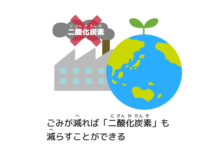 「リユース」して何度(なんど)も使(つか)うと、ごみがたくさん減(へ)るよね。ごみが減(へ)れば、ごみを燃(も)やすことも少(すく)なくなるから、地球(ちきゅう)を暑(あつ)くする「二酸化炭素(にさんかたんそ)」も出(で)にくくなるよ。