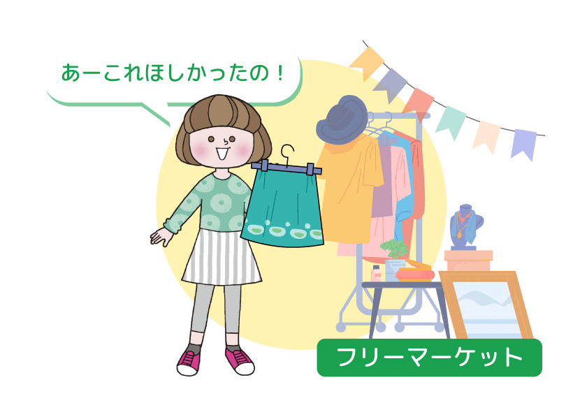 「リユース」を生活(せいかつ)に取(と)り入(い)れるには、いろいろな方法(ほうほう)があるよ。たとえば、いらなくなったスカートをフリーマーケットでだれかに使(つか)ってもらえるようにすることが「リユース」なんだ。他(ほか)には、いらなくなった服(ふく)でぞうきんを作(つく)ったり、空(あ)き箱(ばこ)をペン立(た)てやおもちゃ作(づく)りに使(つか)ったりするのも素敵(すてき)なアイデアだね。少(すこ)しの工夫(くふう)で、ごみを減(へ)らして、だれかの役(やく)に立(た)つことを考(かんが)えてみてね。