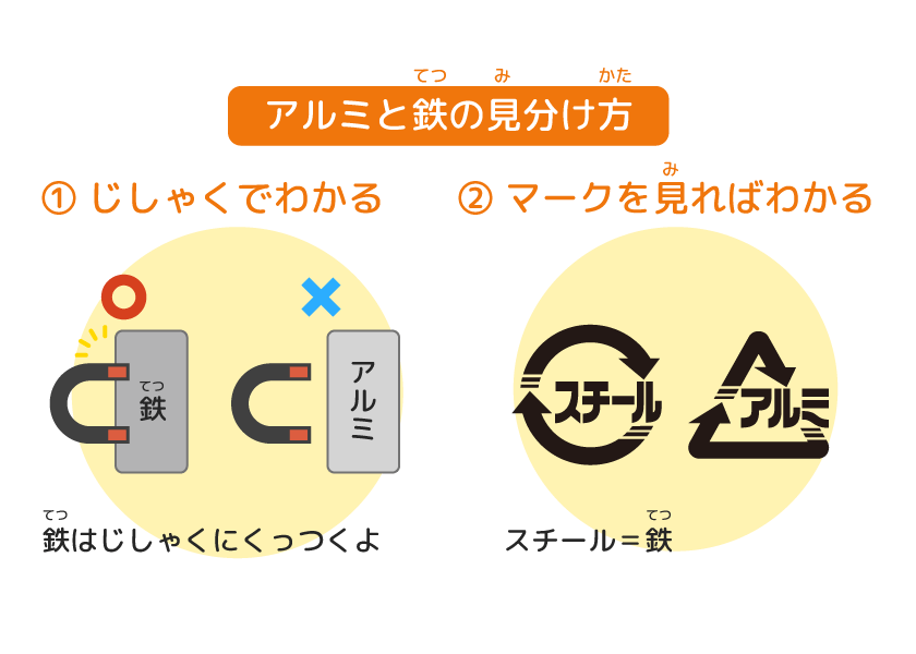 見分(みわ)け方(かた)は、①じしゃくでくっつくのが鉄(てつ)、くっつかないのがアルミ。②缶(かん)に表示(ひょうじ)されているマークを見(み)ればわかるよ。