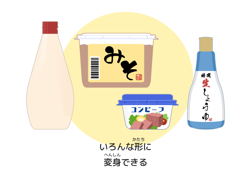 容器(ようき)は、いろいろな素材(そざい)で作(つく)られています。金属(きんぞく)は、中身(なかみ)をしっかり守(まも)るじょうぶな素材(そざい)。プラスチックは、軽(かる)くていろんな形(かたち)にできる便利(べんり)な素材(そざい)。紙(かみ)は、軽(かる)くて、び生物(せいぶつ)が分解(ぶんかい)しやすくて、自然(しぜん)にもやさしい素材(そざい)。ガラスは、中身(なかみ)が見(み)えておしゃれに見(み)せることができる素材(そざい)です。