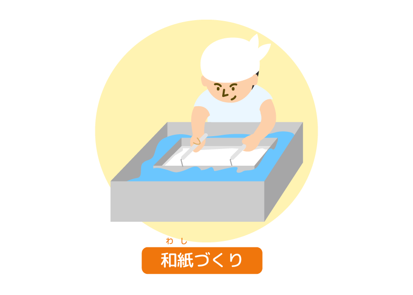 紙(かみ)コップ、紙(かみ)パック、ダンボールなどは紙(かみ)から作(つく)られているよ。紙(かみ)は、昔(むかし)から日本(にほん)にある「和紙(わし)」のように、とても長(なが)い歴史(れきし)があるんだ。昔(むかし)は木(き)の皮(かわ)で作(つく)られていたんだけど、今(いま)は、主(おも)に木(き)からできる「パルプ」や、使(つか)い終(お)わった古紙(こし)をリサイクルして作(つく)られている。紙(かみ)の容器(ようき)は、プラスチックやガラス、缶(かん)と比べると、軽(かる)くてび生物(せいぶつ)を分解(ぶんかい)しやすいのが特(とく)ちょうなんだ。