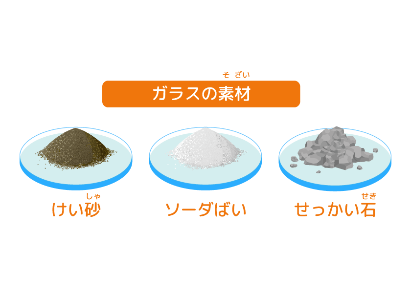 ジャムやジュースのびんなど、ガラスの容器(ようき)は、いくつかの材料(ざいりょう)から作(つく)られているよ。けい砂(しゃ)、ガラスをとけやすくするためのソーダばい、ガラスをじょうぶにするためのせっかいなど。さらに、ごみを減(へ)らせるように、使(つか)い終(お)わったガラスびんをこなごなにくだいたものも使(つか)って再利用(さいりよう)されているよ。