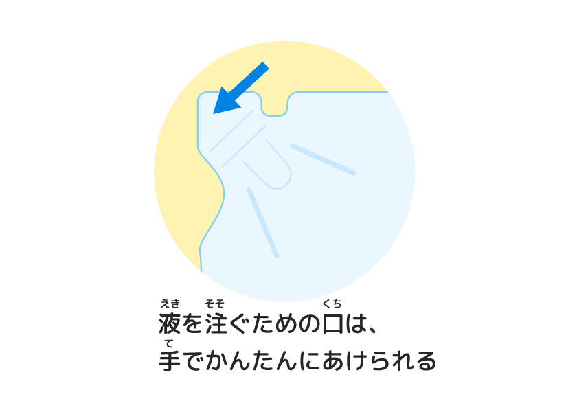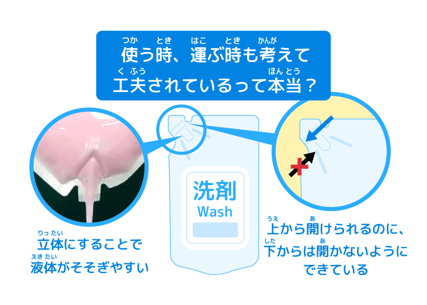 せんざい用(よう)パウチには、液(えき)を出(だ)すところが飛(と)び出(だ)しているタイプがあるよね。これは、ボトルに液(えき)を入(い)れやすくするためなんだ。