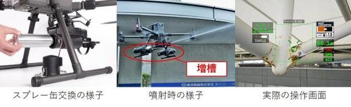 これまで空撮が主な用途であったドローンに対し、新たに作業力を与えることで、足場レスの高所作業を実現します。防錆剤やコンクリートの表面含浸剤による構造物の軽補修作業や、点検時のマーキング作業、忌避剤による鳥害対策など、スプレー缶を交換するだけで幅広い目的で使用することができます。