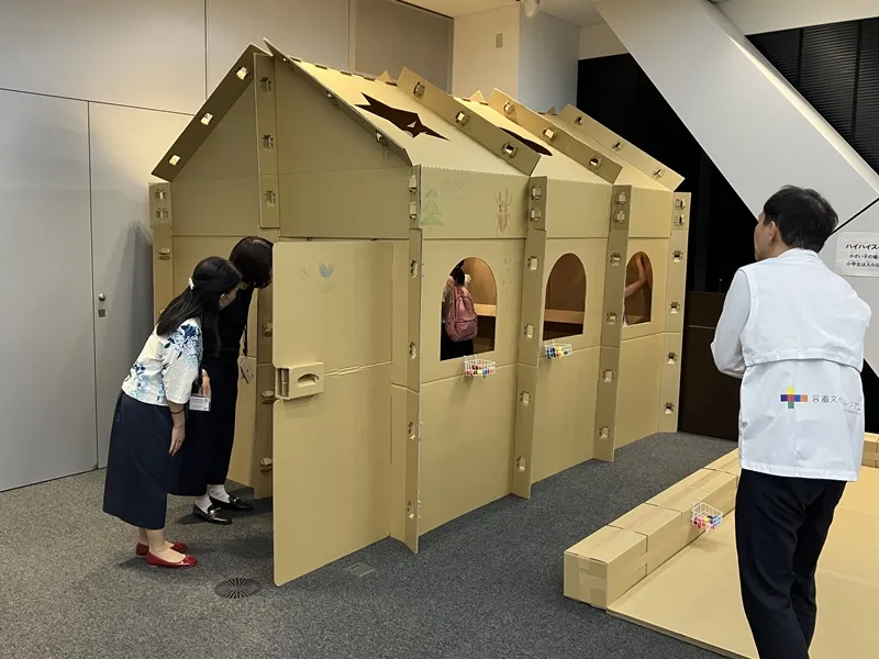 段ボールで作られた家とハイハイスペースを設置しました。段ボールにお絵かきができるこのスペースでは、子どもたちが思い思いにお絵かきを楽しんでいました。