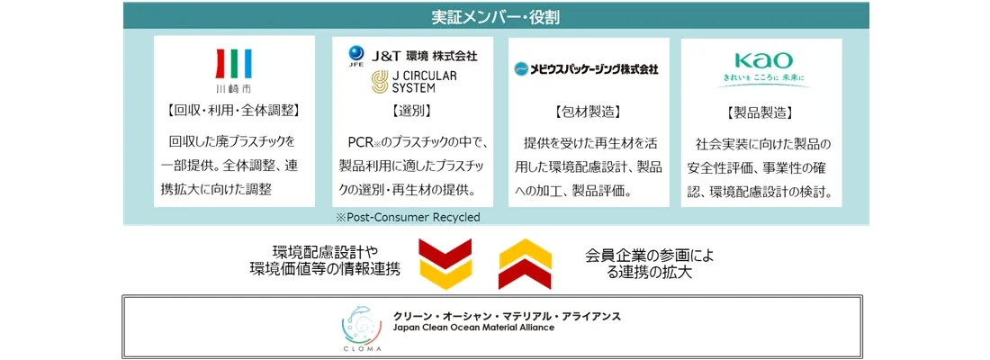 2024年10月より開始される循環実証は、「かわさきプラスチック循環プロジェクト」(以下「かわプラ」)※2に参加する各企業や川崎市を主体に、海洋プラスチック問題に取り組む国内最大級の団体「Japan Clean Ocean Material Alliance(CLOMA)」と連携して進められます。メビウスパッケージングは、循環実証の中で、かわプラ所属メンバーより提供を受けた再生材を活用した環境配慮設計、製品への加工および製品評価の役割を担う予定です。