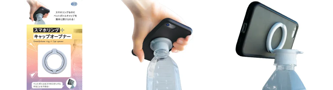 本製品はPETボトルのキャップを開栓するオープナーとスマホリングの機能を組み合わせたことで、場所を選ばず、いつでもどこでも軽い力でキャップを開けることを可能にします。キャップを開けることが難しいと感じる方もさりげなく使用でき、その社会的意義が評価され、今回の受賞に至りました。