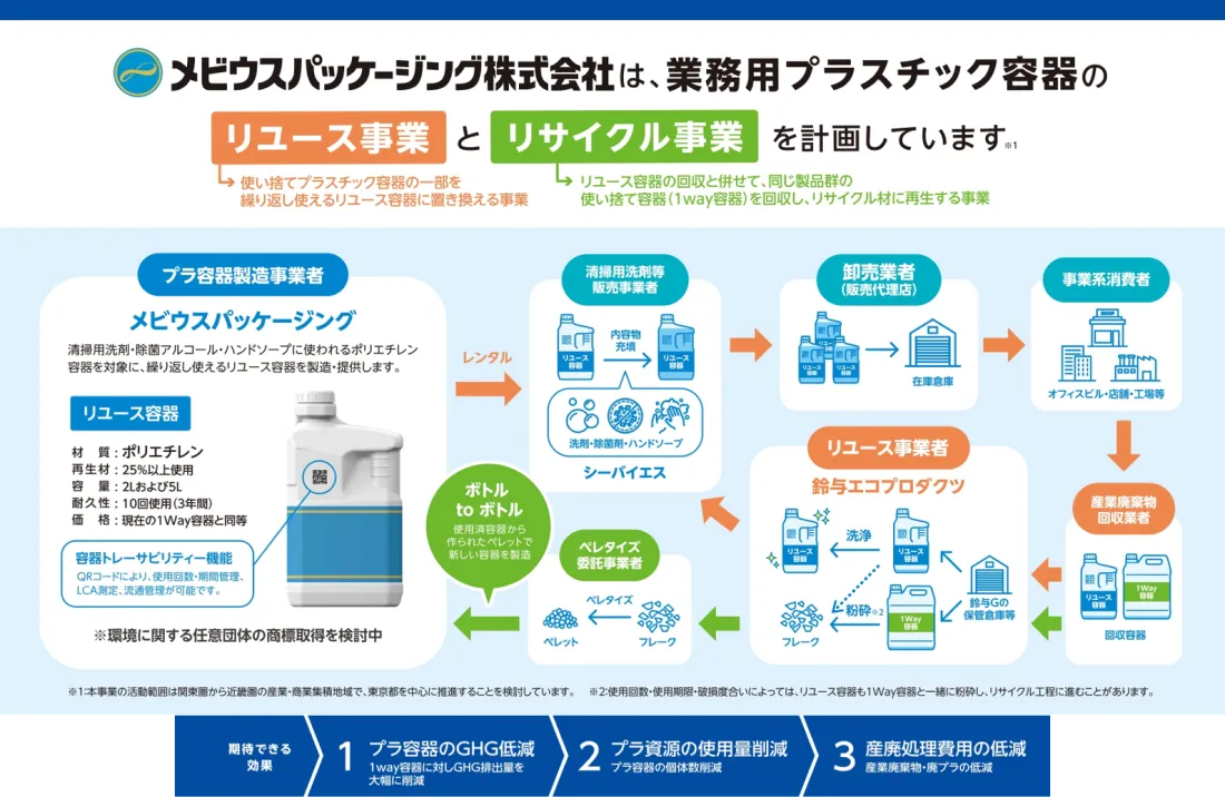 当社の連結子会社であるメビウスパッケージング株式会社(本社:東京都品川区、代表取締役社長:飯田高、以下「メビウスパッケージング」)は、シーバイエス株式会社(本社:神奈川県横浜市、代表取締役会長兼社長:諸星重文、以下「シーバイエス」)および鈴与エコプロダクツ株式会社(本社:静岡県袋井市、代表取締役社長:岩崎栄二、以下「鈴与エコプロダクツ」)との三社共同で、業務用小型プラスチックボトルのリユース・リサイクル事業における実証実験を、2025年10月より開始します。
