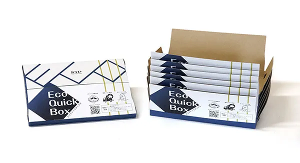 エコクイックボックスは、通販用段ボール箱の形態変更を行い、資材のトータルコストの20%削減と、箱の組立作業工数の大幅削減を実現しています。「作業現場での効率化」は様々な改善が為されていますが、意外に注目されていないのが「箱組み」に関わる効率と費用です。既に組まれた(四隅が貼られた)箱、底がワンタッチで組み上がる箱を使用の場合、その箱には、箱の形にするための製造コストがかかっています。また、現場で手組みをする箱をご使用の場合、人件費を割かなくてはいけません。箱組みを自動化することで箱の購入費・人件費の削減にもつながります。