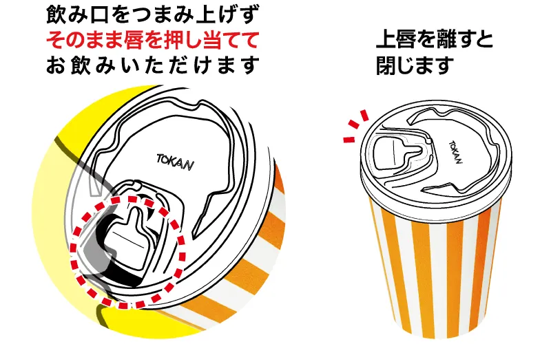 飲み口の突起部に上唇を軽く押し当てることで飲み口が開き、コップを傾けて飲むことができるノンアクション方式のフタです。高齢者や手指の不自由な方でも比較的簡単に飲むことができます。また、唇を離すと飲み口が閉じ、虫やほこりの侵入を防ぐほか、移動時などの振動による液漏れも防ぎます。