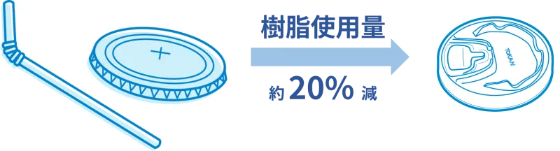 ストロー飲用品(平フタ+樹脂ストロー合算※1)に比べ、樹脂使用量を約20%削減しました。これにともない、樹脂原料由来のGHG排出量※2を約20%削減しました。※1 東罐興業製の同じ口径のフタ+ストローとの重量比で計算※2 樹脂原料製造時のGHG排出量として