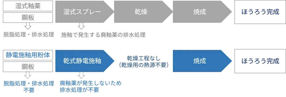 静電施釉用粉体は水を使用していません。従来の釉薬(湿式釉薬)は水が配合されており、油分が付着した鋼板は事前の脱脂処理が必要ですが、水不使用の静電施釉用粉体は脱脂処理を省略できます。このため、脱脂処理や湿式スプレー施釉にともなう排水処理も省略することができます。また、施釉後の乾燥工程も不要のため、工数削減やエネルギー削減に貢献できます。