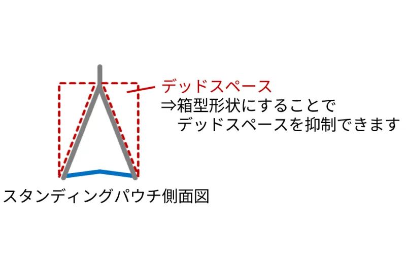 従来のスタンディングパウチは、輸送時に空間が上部にできてしまいますが、本製品は箱型形状を採用することで、デッドスペースを抑制でき、輸送効率を向上させます。液充填前の空袋はたたんで輸送でき、廃棄時にもたたむことでかさばりません。