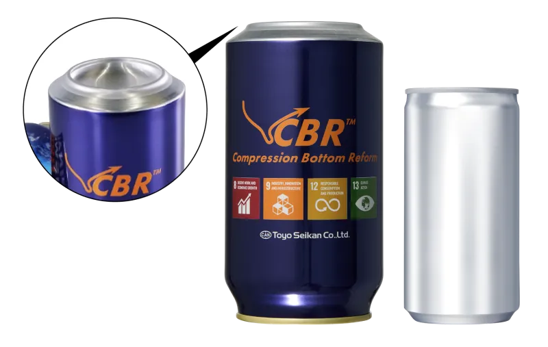 東洋製罐は、飲料缶の底部をリフォームして強化し、軽量化を可能とする缶底耐圧強度向上技術(CBR(Compression Bottom Reform))を使用したアルミ飲料缶の開発を実現しました。この技術は、aTULC缶胴径202径(190ml)とアルミDI缶胴径211径(350ml・500ml)に採用されています。これにより、GHG排出量のさらなる削減が期待されます。 【2024年3月26日プレスリリース】東洋製罐が国内最軽量アルミ缶の開発を実現、量産を開始-温室効果ガス排出量削減へのさらなる貢献- 【2024年8月29日プレスリリース】東洋製罐の世界最軽量アルミ缶 コカ・コーラ社の「ジョージア」で採用、量産開始-GHG排出量のさらなる削減を実現-