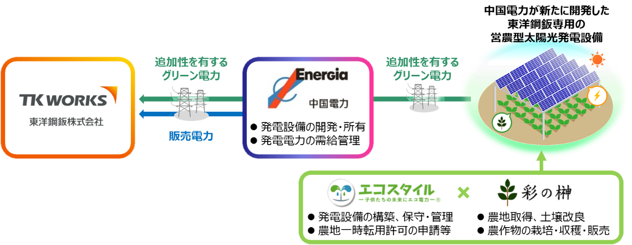 東洋鋼鈑では、中国電力株式会社(以下「中国電力」)との間で、オフサイトPPA※1に関する契約を締結し、営農型太陽光発電設備の導入を進めています。中国電力が株式会社エコスタイルおよび株式会社彩の榊と協力して、営農型太陽光発電所を新たに計64MW開発し、発電した電力と環境価値を下松事業所に供給する予定です。なお、営農型太陽光発電※2を活用したオフサイトPPAは、中国地域では初の取り組みとなります。下松事業所では2030年度までに使用する電力量の約20%を追加性※3を有するグリーン電力に置き換える計画であり、これにより年間約25,000tのGHG削減効果が期待されます。また、この取り組みにより、耕作放棄地の再生利用や農業経営の改善による地域農業の活性化にも寄与することが期待されます。