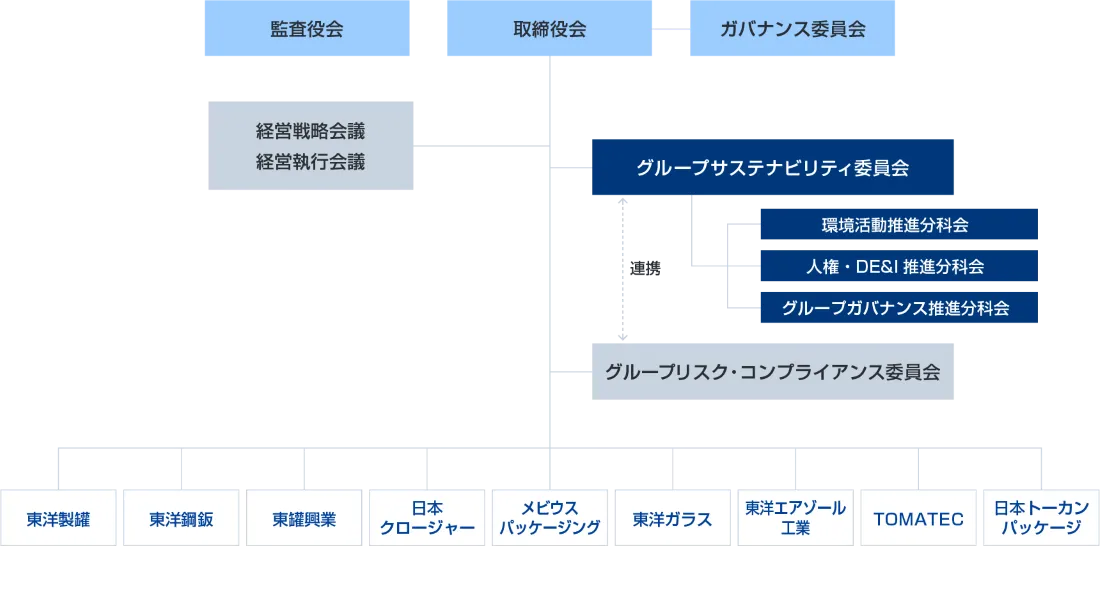 東洋製罐グループは、気候変動および自然資本・生物多様性の課題への対応を含むグループ全体のサステナビリティ関連の活動を統括するグループサステナビリティ委員会を設置しており、同委員会はグループリスク・コンプライアンス委員会と共に、重要委員会の1つと位置づけられています。本委員会は、サステナビリティ経営推進に関する事項についての協議を行う場であり、目標・計画に対する進捗管理に加え、社会的・国際的情勢や法規制の動向、外部環境の変化を踏まえた計画の見直し、新規施策の検討を実施しています。気候変動および自然資本・生物多様性に関連する目標・計画である「Eco Action Plan 2030」の進捗管理についてもこの委員会で行われます。また、東洋製罐グループは国や地域におけるさまざまな社会的課題を認識し、東洋製罐グループの製品・サービスをご利用いただいているお客さま、お取引先、地域社会など、ステークホルダーの皆さまと対話、協働し、事業を通じて社会課題の解決に取り組んでいます。