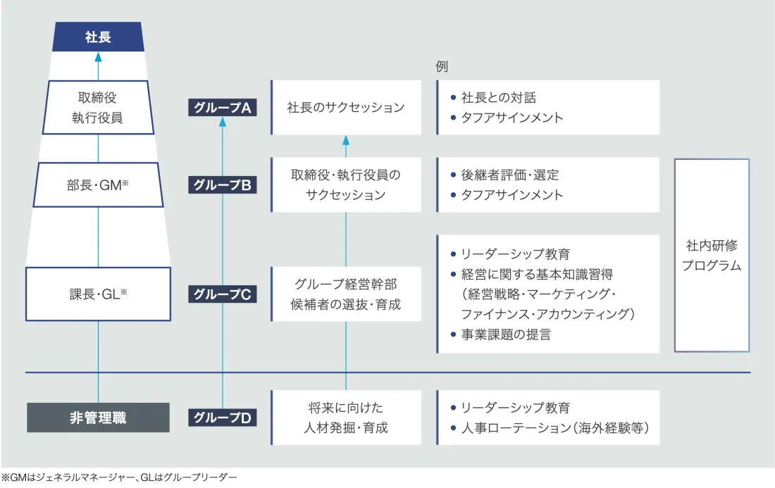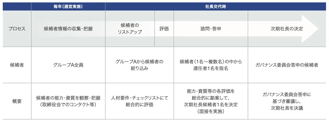 なお、ガバナンス委員会は諮問機関としてサクセッションプランの策定と運用のほか、代表取締役の選定・解職、取締役候補者・監査役候補者の指名について取締役会に対して答申を行い、取締役会がサクセッションプランの承認および運用の監督、役員人事を決定しています。