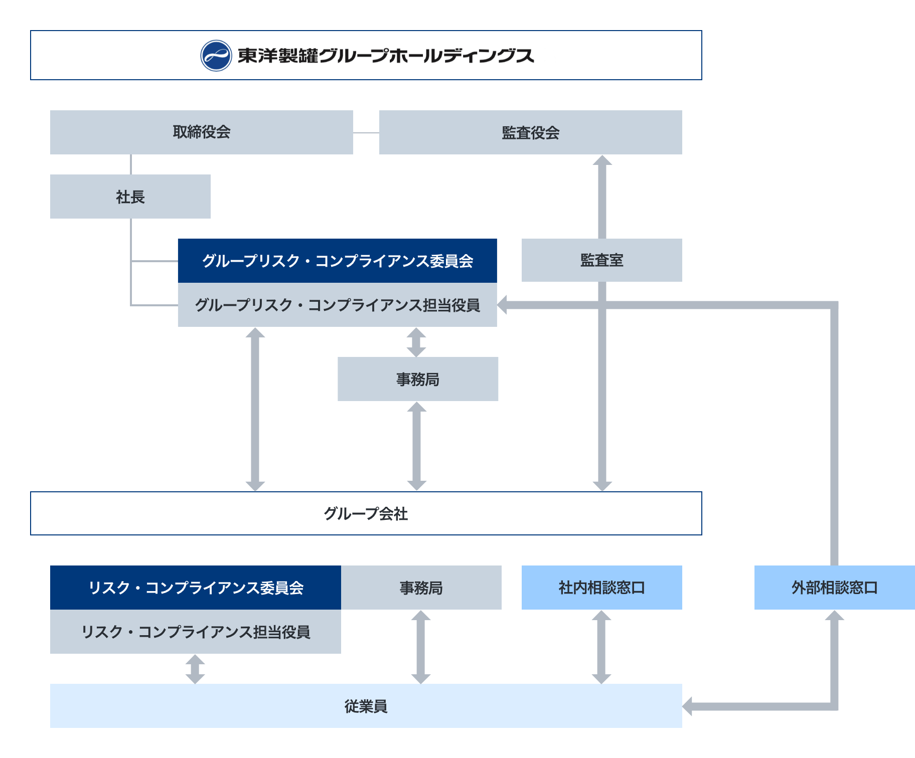 東洋製罐グループを取り巻くリスクや危機事象に対応し、継続的な事業活動に影響を及ぼすリスクの発生を未然に防止するため、リスク・危機管理体制を強化する組織として「リスク危機管理委員会」、グループのリスク・危機管理ならびにコンプライアンスを横断的に統括する「グループリスク・コンプライアンス委員会」を置き、その事務局として「リスク危機管理統括室」を設置しています。両委員会では、リスクに関する社会動向等の情報共有、重要リスクに関する対応状況の確認、改善および予防措置を講じています。また、当社およびグループ各社では、経営基盤の安定化を図るため、それぞれの管理体制のもとで危機管理規程や危機対応マニュアルなどの策定、リスク管理状況の取りまとめ、委員会への報告などを行っています。