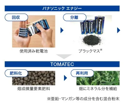 お客さまとの共同開発TOMATEC(株)はパナソニックエナジー(株)と共同で、使用済みの同社製乾電池を微量要素肥料の原料として再利用するリサイクルプロセスを確立し、2024年度に肥料販売を開始しました。今後もお客さまと連携し、資源の再利用などの取り組みを通じて、環境負荷の低減と持続可能な社会の実現を推進していきます。 |