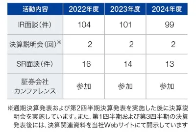 IR・SR面談活動IR・SR面談では資本収益性、株主還元方針などについて多くのご意見をいただきました。貴重なご意見を経営戦略に反映し、より良い価値提供を実践していきます。 |
