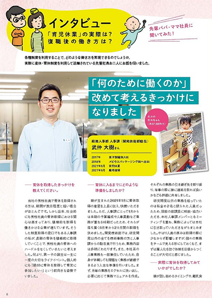 また、男性・女性の育児休業取得者の体験談やインタビューを社内広報誌に掲載するなど、性別を問わず育児をしながら多様な働き方を選択できる環境・風土づくりを進めていきます。
