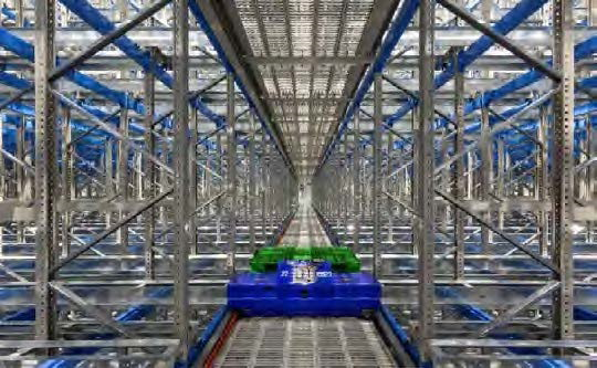 2023年4月より営業を開始した東洋メビウスの熊谷物流センターでは、物流の平準化・効率化・共同化に向けた基盤構築を進めています。高密度倉庫棟には住友重機械搬送システム株式会社の自動倉庫「マジックラック」を採用し、ディープストレージ(多重配列保管)方式により保管効率が向上しました。入出庫と荷揃えの自動化により保管エリア内でのフォークリフト作業を削減するなど、自動化や省人化に注力し、従業員の負荷軽減と構内の安全性向上を図っています。
